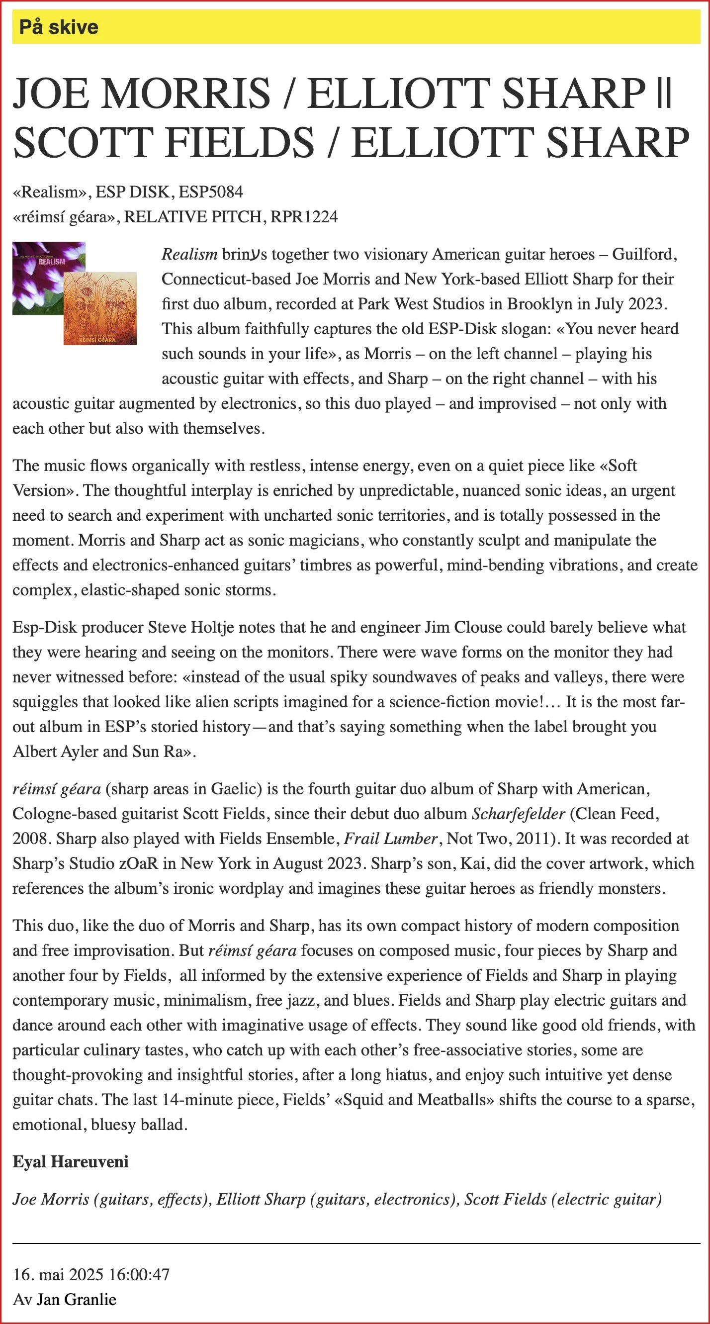 Studio zOaR , New York, August 2023: Elliott Sharp, Scott Fields – electric guitars, compositions. Eight tracks, 55 minutes.